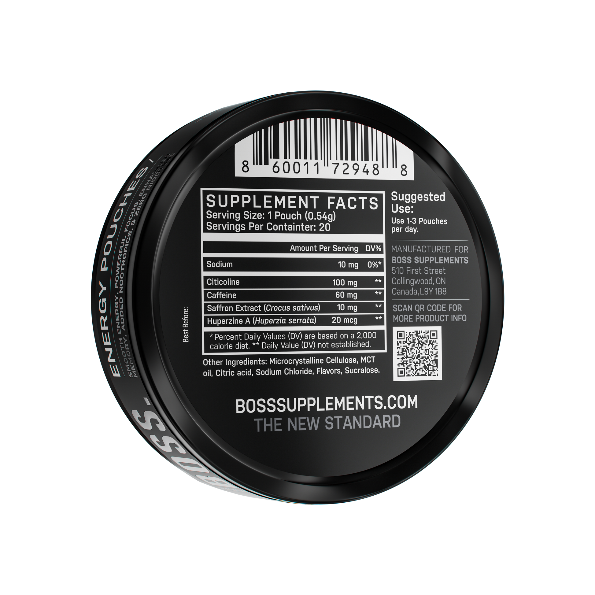 Most energy products give you a spike and leave you wrecked. We built something different. BOSS Energy Pouches deliver 60mg of clean caffeine alongside 100mg of Citicoline for razor-sharp mental clarity, 20mg of Huperzine A to keep your focus locked in, and 10mg of Saffron Extract to keep your mood dialed. No jitters. No crash. Just smooth, sustained energy and a mind that's actually firing on all cylinders. Toss one in wherever you are - no water, no shaker, no BS. This is what it feels like when energy and focus work together the way they're supposed to.